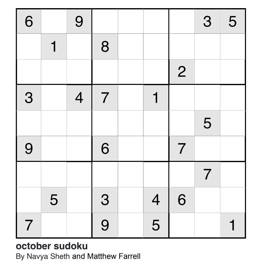 This 9 x 9 grid is divided into nine rows, nine columns, and nine 3 x 3 boxes. When the puzzle is solved, each digit from 1 to 9 will appear exactly once in each row, column, and 3 x 3 box. Some spaces have already been filled; use those digits to deduce the remaining spaces.